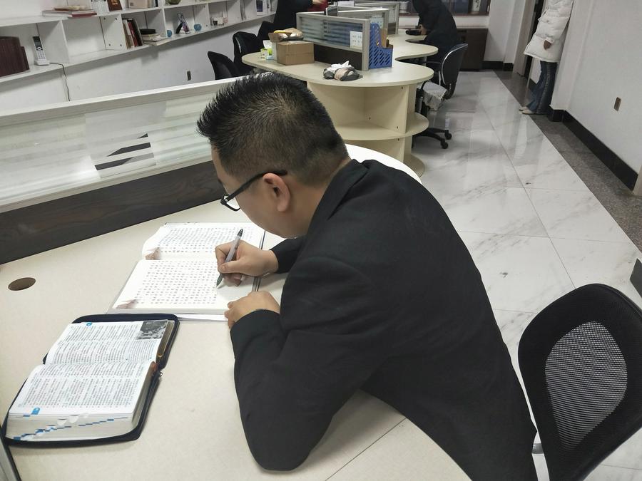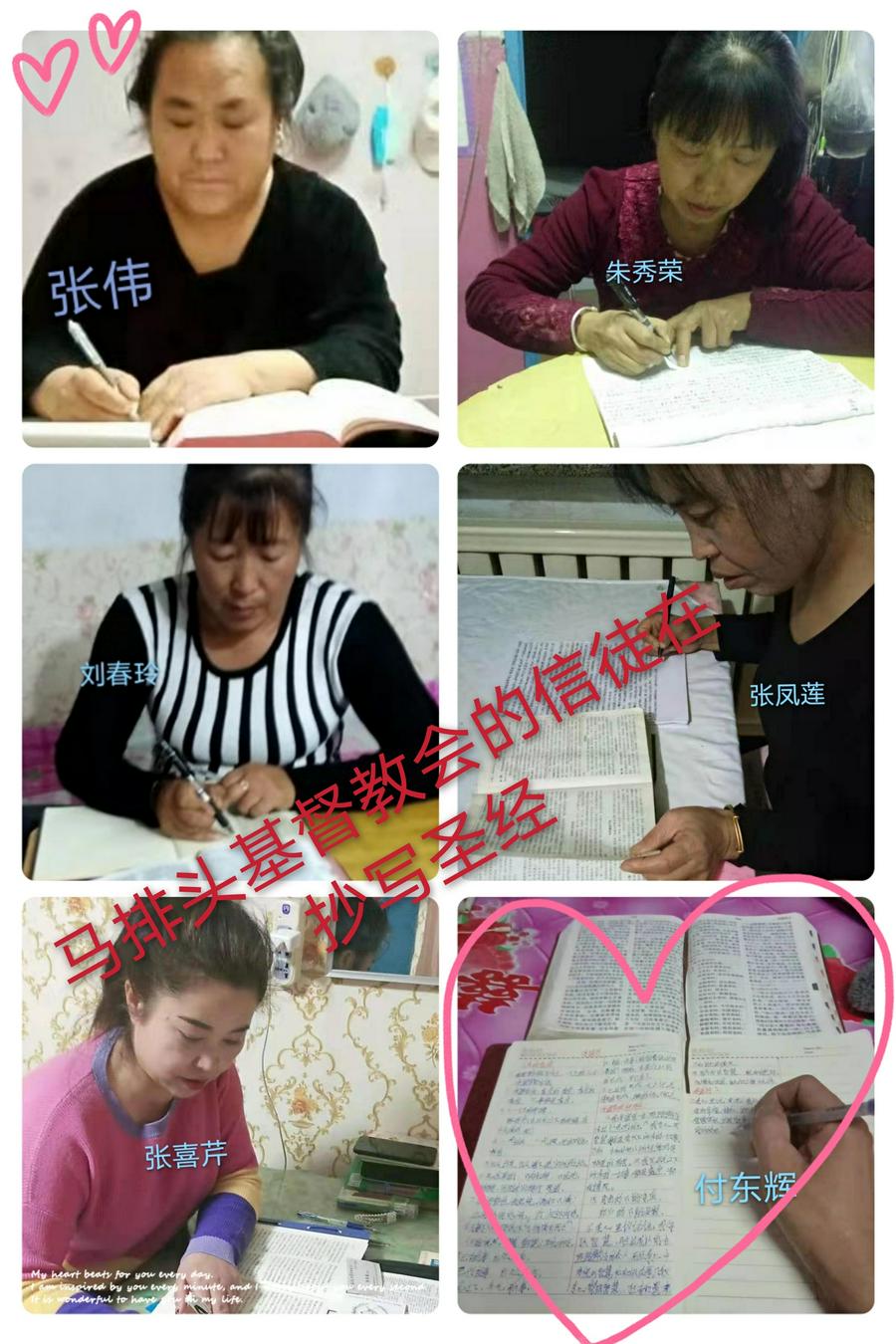 长春市双阳区马排头基督教堂的十五位弟兄姊妹在抄写圣经,最早的从2010年就开始抄写圣经,一位80多岁的老姊妹已经抄写了两遍。一位叫刘晓芳的姊妹,由于身体有病,不能来教会聚会,就在家里抄写圣经,已经抄写完一遍,第二遍也抄写一半了。