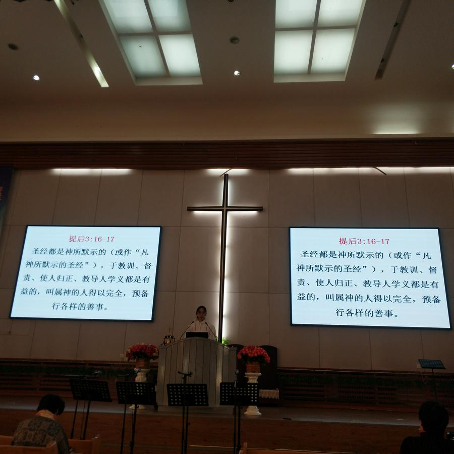 洮南市育英基督教堂“圣经日”主题敬拜,张红牧师引用《圣经·提摩太后书》3章16节至17节的经文,以《读经、行道》为题证道。