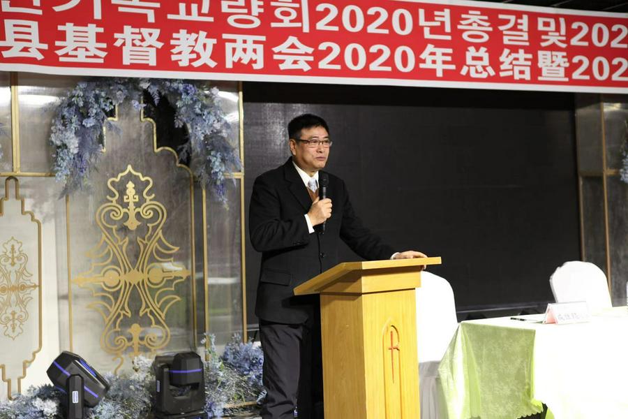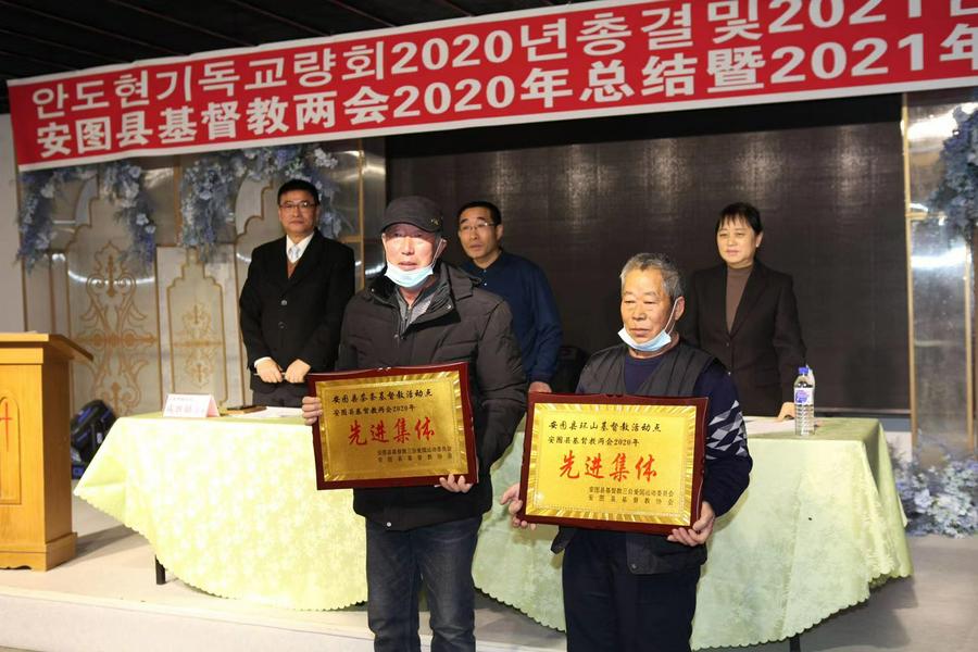 集体学习后,咸胜镐牧师代表安图县基督教两会常委会做2020年工作总结并提出2021年工作计划,同时发布了财务报告。经全体场所负责人审议,通过了工作总结和财务报告,并确定了2021年工作计划。选举茶条基督教活动点和环山基督教活动点为2020年度先进集体;李圣山和王德梅为2020年度先进个人,并颁发了奖牌。为了表达在疫情期间和有序恢复聚会过程中,安图县民宗局对全县活动场所的帮助,安图县基督教两会向安图县民宗局赠送锦旗。安图县民宗局主要领导到会讲话,在肯定县基督教两会工作的同时,他高度评价了基督教场所在疫情期间的担当和付出,并嘱咐在即将到来的圣诞节期间要遵守防疫要求,做好防疫防灾防火工作。