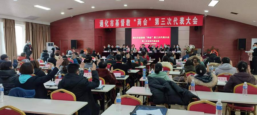 会议通过了修改后的《通化市基督教三自爱国运动委员会章程》《通化市市基督教协会章程》和《通化市基督教教会规章》;向全市信众和活动场所发出了《通化市基督教“坚持基督教中国化方向,坚决抵御境外基督教势力渗透”倡议书》;选举产生了通化市基督教两会第三届委员会、常务委员会和领导班子。曲维鹏牧师当选为通化市基督教三自爱国运动委员会主席兼通化市基督教协会会长;金镇国、 吴宗世、于长江、金玉顺、革云芹、金鑫、宋辉、李正顺、张德财、朴明植、李善德、卢长富、程宝国当选为副主席兼副会长;白媛传道员任通化市基督教三自爱国运动委员会秘书长兼通化市基督教协会总干事。