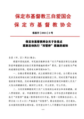 为做好疫情防控,保障信徒的身体健康和生命安全,自2021年1月4日起,保定市基督教暂停了所有堂点的聚会和活动,转为网络直播的形式。