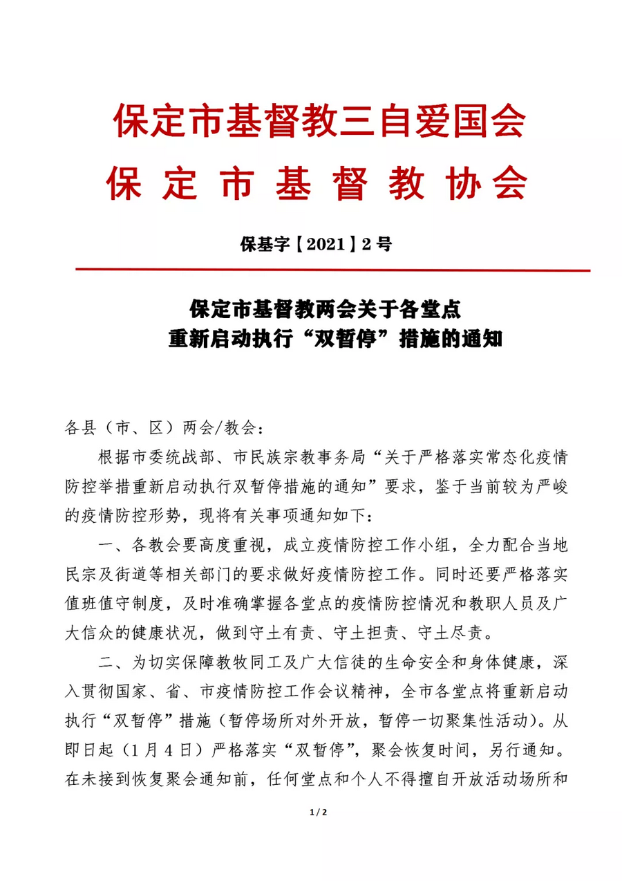 二、为切实保障教牧同工及广大信徒的生命安全和身体健康,深入贯彻国家、省、市疫情防控工作会议精神,全市各堂点将重新启动执行“双暂停”措施(暂停场所对外开放,暂停一切聚集性活动)。从即日起(1月4日)严格落实“双暂停”,聚会恢复时间,另行通知。在未接到恢复聚会通知前,任何堂点和个人不得擅自开放活动场所和组织聚集性活动。在“双暂停”期间,各教会要采取可行的方式做好对信徒的牧养、关怀、疏导工作。