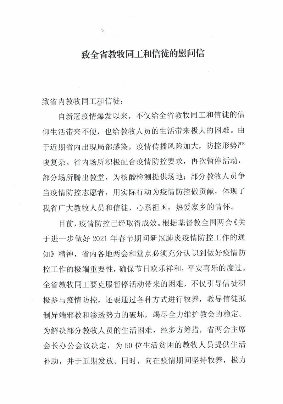 在发放贫困教牧生活补助的同时,吉林省基督教两会还向全省教牧同工和信徒发出一封春节慰问信。信中说,由于局部发生聚集性疫情,全省场所再次暂停聚会,教牧同工要继续克服困难,竭力维护教会的稳定,引导信徒积极参与疫情防控,通过各种方式牧养信徒,抵制异端邪教的破坏活动,努力维护社会的稳定。春节期间,疫情防控和消防安全不能放松,场所要积极落实防控措施,确保广大教牧同工和信徒过一个喜乐祥和的春节。