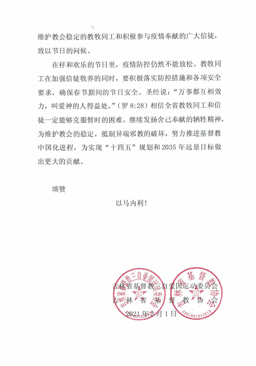 2021年2月1日,在春节即将到来之际,吉林省基督教两会为50位生活困难的基层教牧同工发放生活补助,并向全省教牧同工和信徒发出一封春节慰问信。