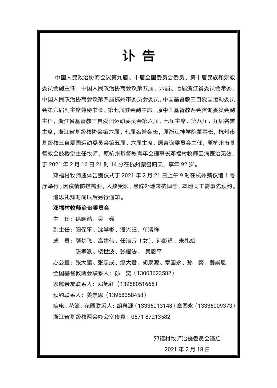邓福村牧师遗体告别仪式于2021年2月21日上午9时在杭州殡仪馆1号厅举行。因疫情防控需要,人数受限,恳辞外地来杭悼念,本地同工需事先预约。