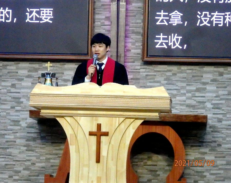 今天的主日聚会在诗班和会众的敬拜赞美声中开始。四楼由安奉勋牧师用朝鲜语为朝鲜族弟兄姊妹讲道,大屏幕显示的也是朝鲜语,笔者不懂朝鲜语,但是有一句通用的就是“阿们”听得懂;二楼由年轻的安恩光牧师用汉语为汉族弟兄姊妹讲道。两堂的聚会证道在同一时间同步举行;分享的经文同为新约路加福音19章11-27节;证道是同一个题目:《正确认识神心意的生活》。