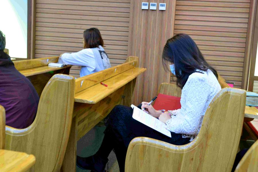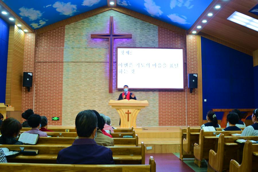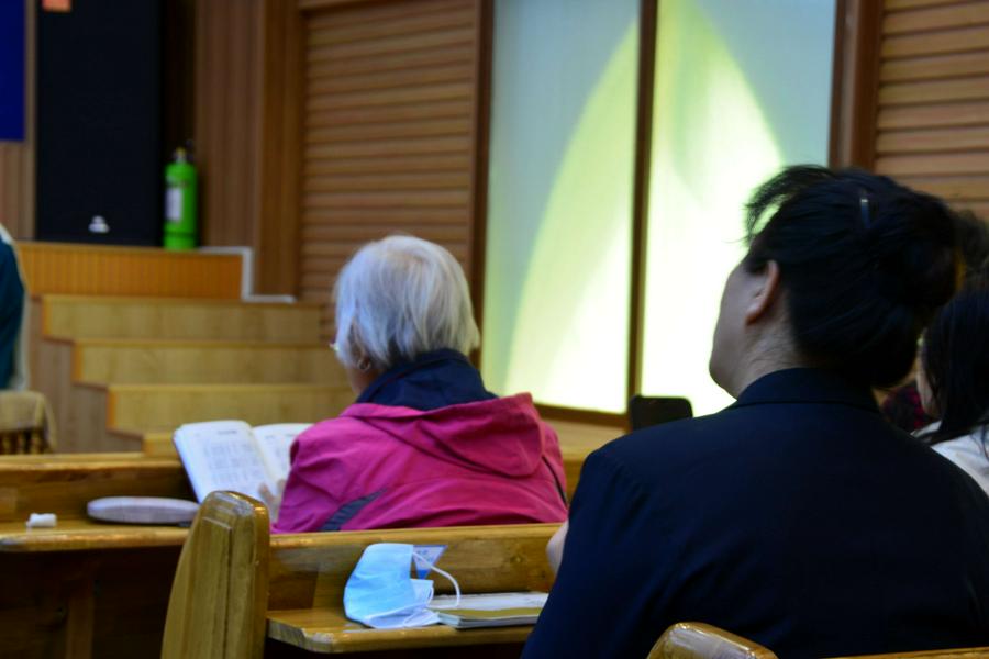 礼拜日的共和堂在按照防疫要求的前提下信徒戴着口罩,扫码、登记、测温,有序的来聚会。不同的是登记分为汉语和朝鲜语两种登记册。教堂主楼二楼为汉族信徒聚会的礼拜堂、四楼为朝鲜族信徒聚会的礼拜堂。笔者在二楼遇到两位同是九十二岁的汉族老姊妹、在四楼遇到了一位九十二岁、一位九十三岁的朝鲜族阿妈尼。真的感谢主!福寿福乐在信徒身上再次彰显,这也是见证!