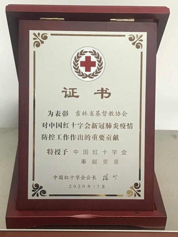 自发生新冠肺炎疫情以来,吉林省基督教两会积极行动,动员全省教职人员和信徒积极配合疫情防控工作,在暂停活动的情况下,采取各种方式为疫情防控所需奉献防控物资和资金,合计800多万元。当吉林省援鄂医疗队完成新冠肺炎的救治任务,全体1209名队员安全返回吉林后,吉林省基督教两会代表全省基督徒,向吉林省援鄂医疗队1209名医护人员,每人赠送慰问金1000元,共计120.9万元,由吉林省红十字会转发给援鄂医疗队医护人员。为了表彰吉林省基督教两会对中国红十字会新冠肺炎疫情防控工作作出的重要贡献,中国红十字会特授予吉林省基督教协会“中国红十字会奉献奖章”及证书,对吉林省基督教在新冠肺炎疫情防控中发挥的积极作用给予肯定和鼓励。吉林省宗教局二处处长郎大民受委托向吉林省基督教两会主席兼会长任大中牧师颁发了“中国红十字会奉献奖章”和证书。