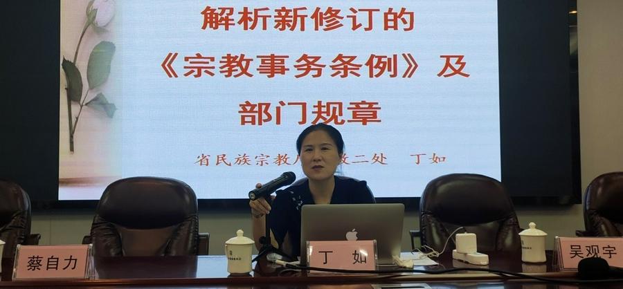 福建省民宗厅丁如副处长作“解析新修订的《宗教事务条例》及部门规章”的报告。她从宗教团体篇,宗教活动场所篇,教职人员篇三个方面作了详细解读。