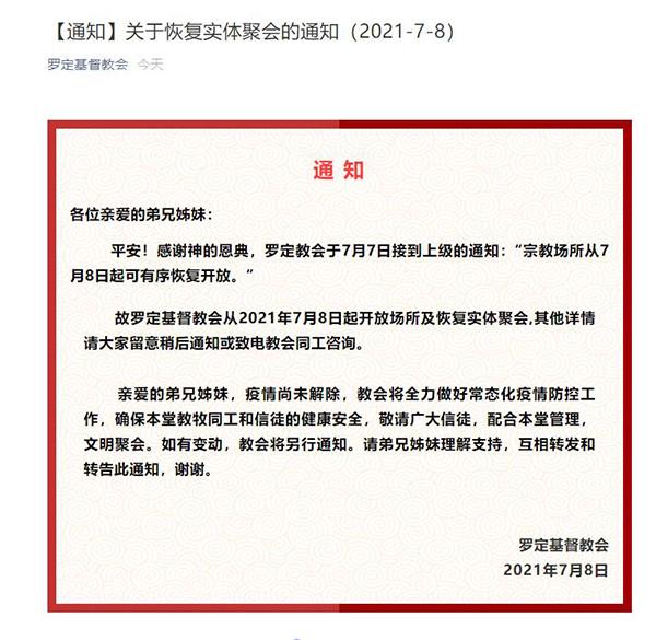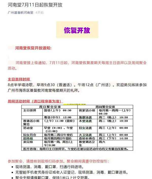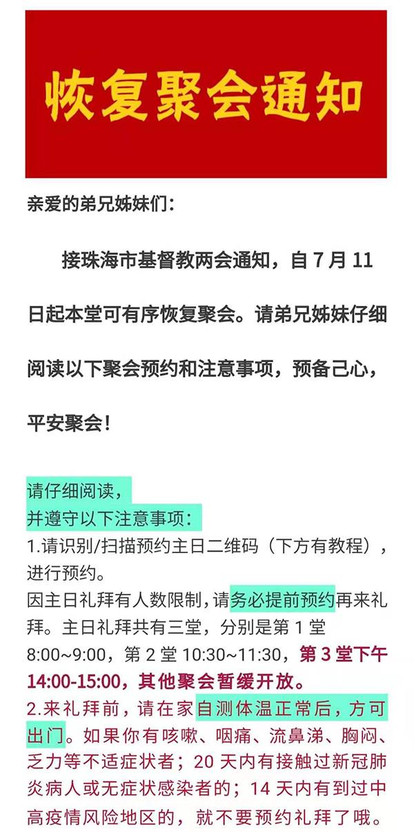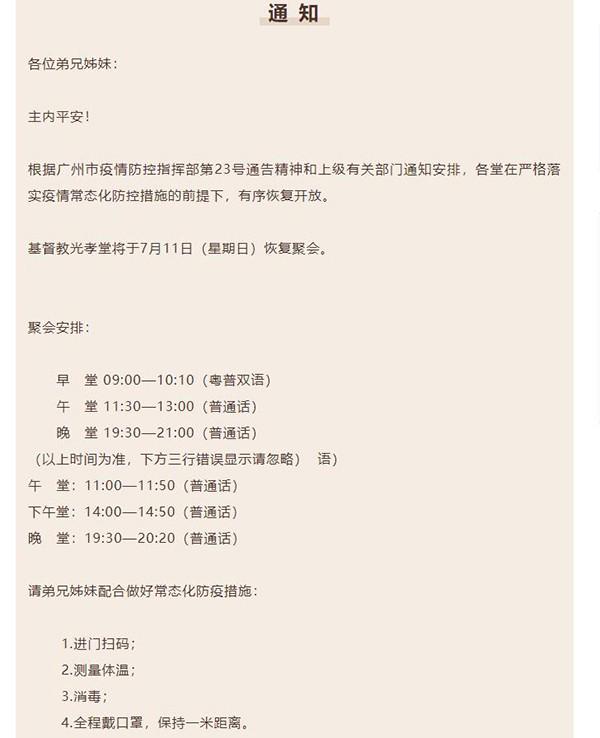 据广州市疫情防控指挥部第23号通告和上级有关部门通知安排,广州市各堂可在严格落实疫情常态化防控措施前提下,有序恢复开放。近日,广州市光孝堂、罗定堂、河南堂、珠海市香洲堂陆续发布公告称,上述堂点将于7月8日(罗定基督教会)以及7月11日有序恢复聚会。望众信徒积极配合教堂做好常态化防疫措施前提下,有序参加聚会。