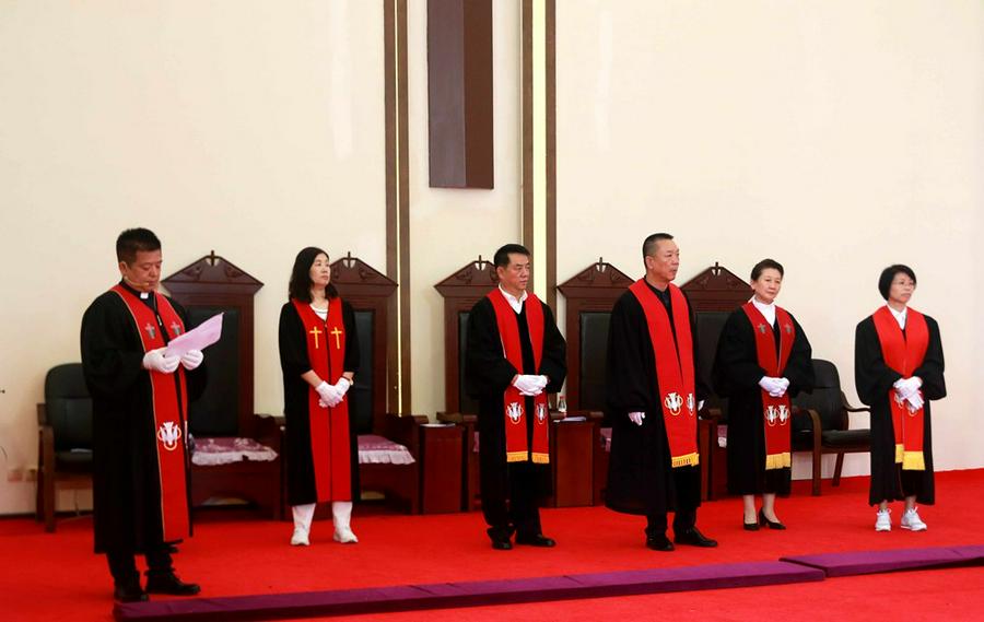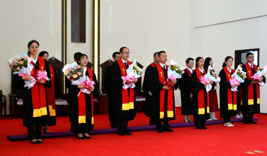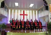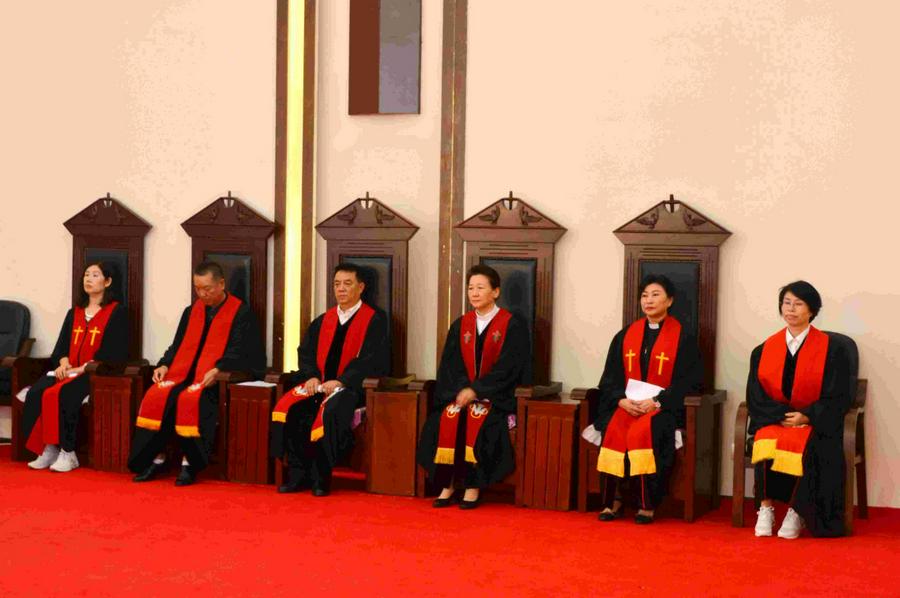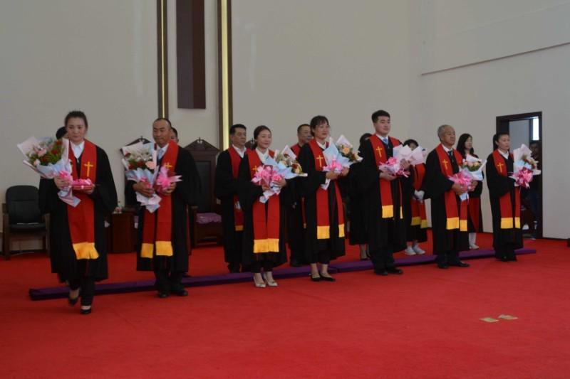 按立典礼由史爱军主席主礼;执行主礼为赵光伟牧师;襄礼为宋善勤、马佑平、蒋杰华、徐文梅、侯玉洁各位牧师。