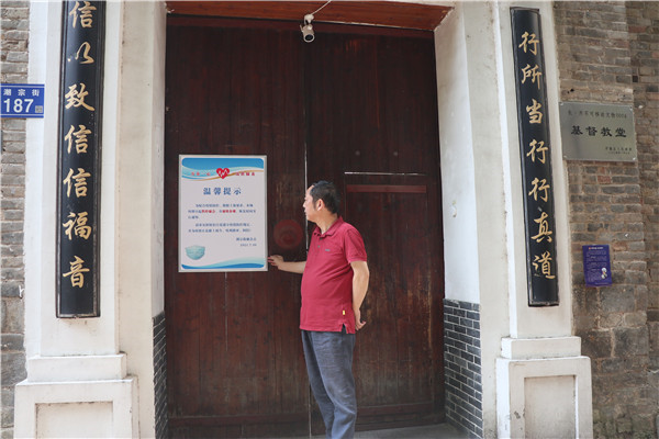 为确保基督教领域的“双暂停”防控工作落实到位,8月3日,长沙市基督教三自爱国运动委员会主席黄克刚牧师带领办公室工作人员深入到长沙市城北堂、北正街教堂、潮宗街聚会点进行暗访暗查,发现市区堂点大门紧闭,严格执行了“双暂停”要求,黄牧师在堂点门外详细查看了宗教场所暂停开放公告张贴和疫情防控知识的宣传落实情况。