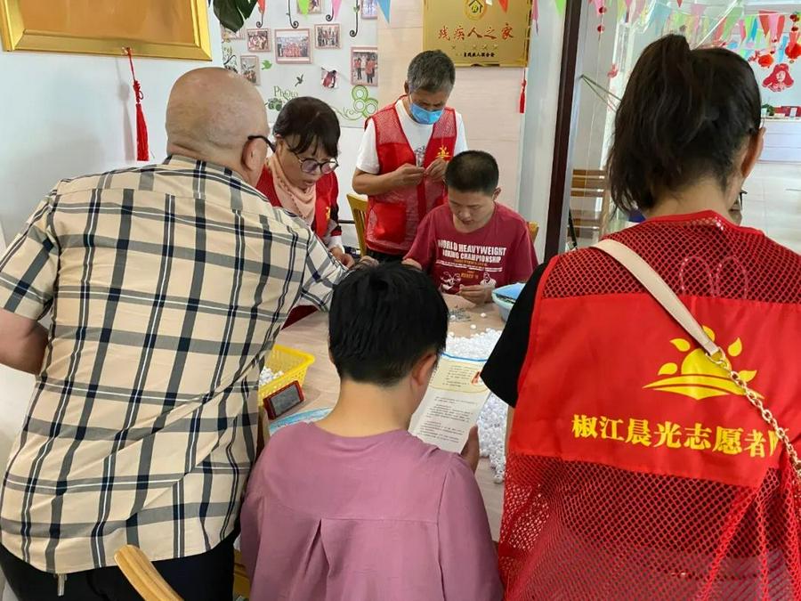 本次活动由晨光服务志愿队与残疾人亲切互动,志愿者体验残疾人的手工制作。孔爱卿老师介绍了本次活动主要内容和意义,希望残疾人在活动中收获反邪教知识和互动的乐趣,共度一个中秋佳节。让他们在友情中感受到志愿者带来的快乐和关爱、关怀。