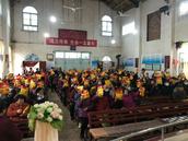 在横幅下,早已站立着几位姊妹在热情招呼着来参加重阳节活动的老人们。只要一看有老人走进院子,姊妹们会笑盈盈赶忙迎上前去。一边说着祝福节日快乐的话语,一边搀扶着老人慢慢朝主堂会场走去。
