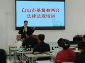 白山市基督教两会主席兼会长张来君牧师详细讲解了《基督教教职人员管理条例》和《如何抵制当前异端》;白山市基督教两会副主席、副会长兼秘书长赵轩牧师带领同工们深入学习了《中国共产党党史》;白山市基督教两会副主席、副会长兼总干事于利华牧师就新修定的《宗教事务条例》进行了说明。