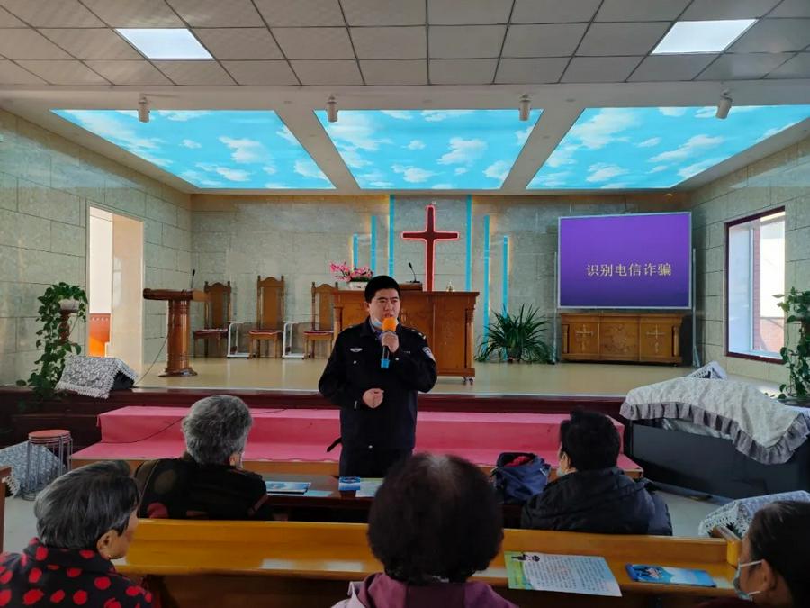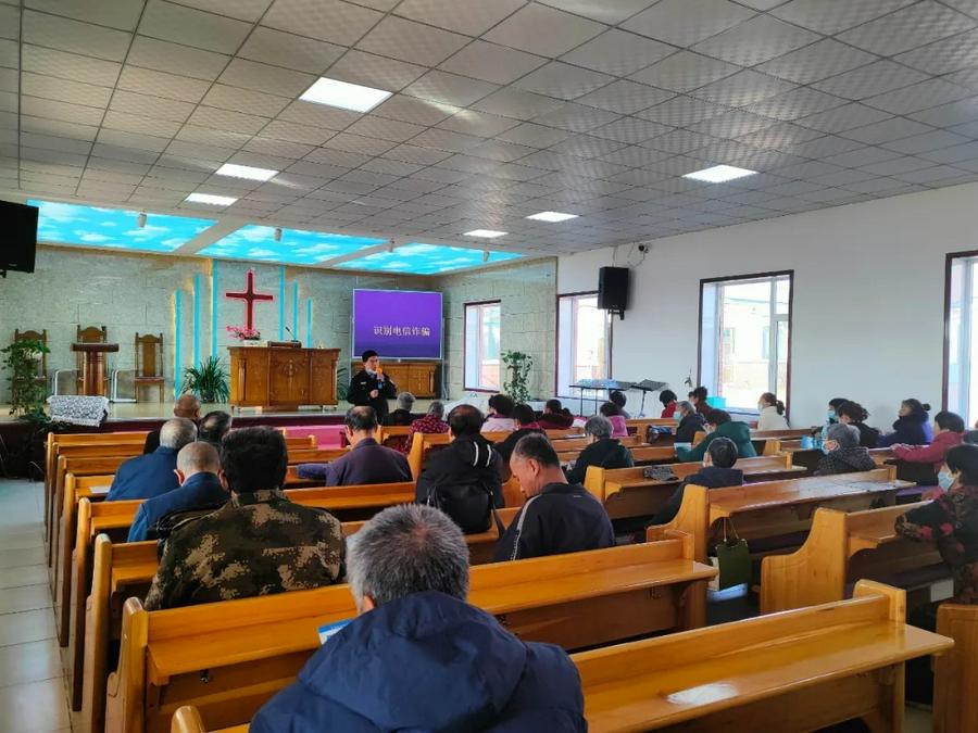 电信网络诈骗新型违法犯罪花样层出不穷,严重损害了百姓的切身利益,防范电信诈骗刻不容缓。为了进一步宣传打击电信网络违法犯罪,增强防范电信诈骗意识,提高信徒防范意识,保护大家财产安全,邀请辖区派出所民警到教堂为信徒讲解相关知识,增强信徒及其家人们的防范意识。
