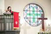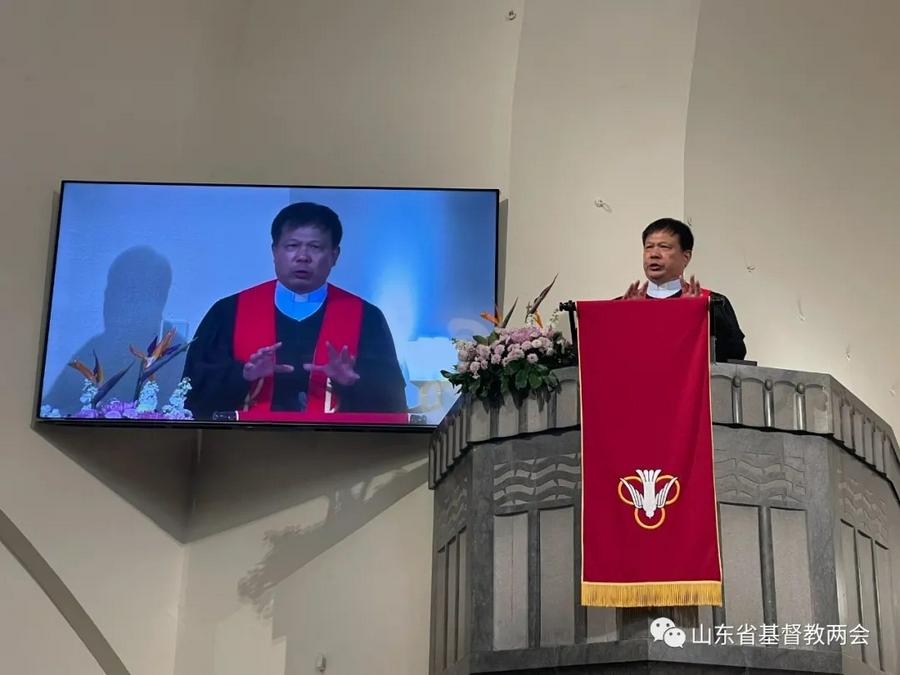 按立典礼由山东省基督教协会会长、青岛市基督教三自爱国运动委员会主任董美琴牧师主礼。