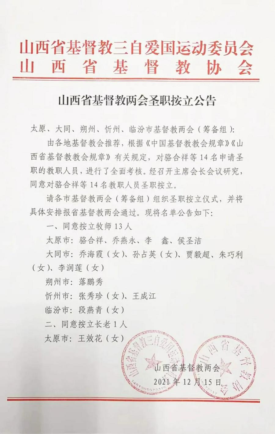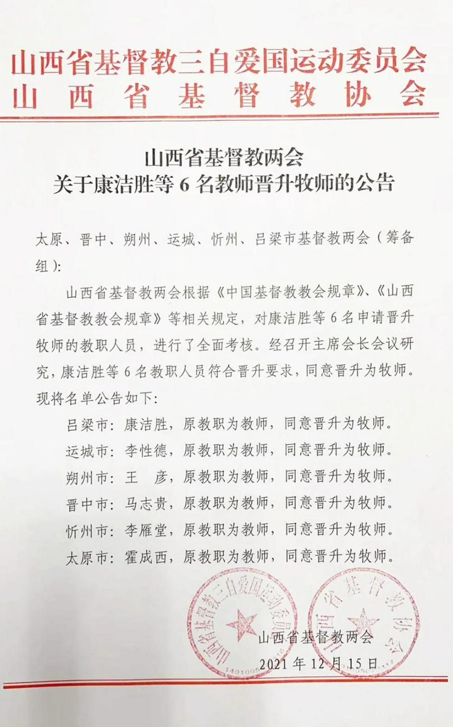 12月15日,山西省基督教两会通过微信公众号发布《山西省基督教两会圣职按立公告》以及《山西省基督教两会关于康洁胜等6名教师晋升牧师的公告》,公布了14位通过考核即将接受圣职按立的教职人员,以及6位符合晋升要求拟晋升为牧师的教职人员名单。