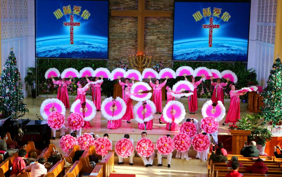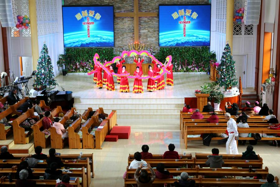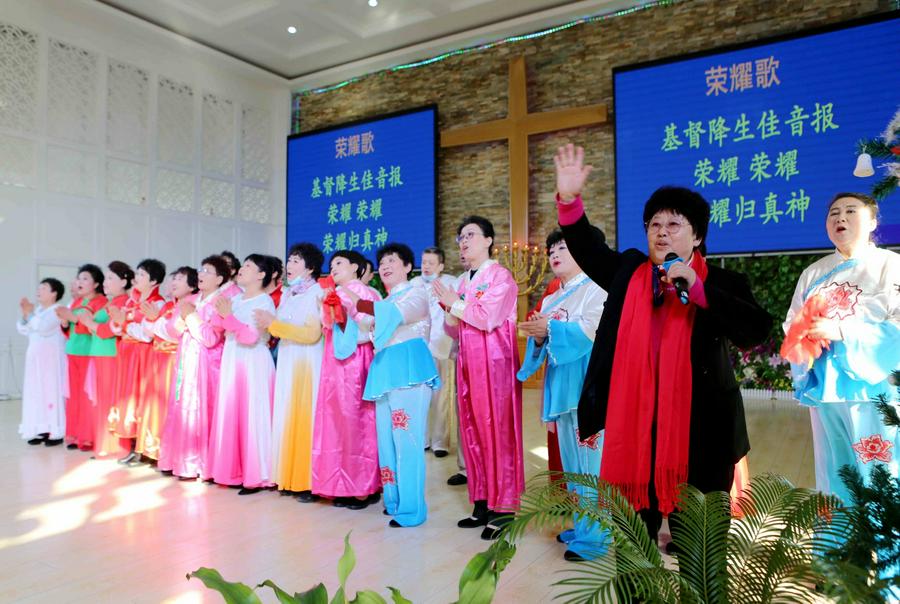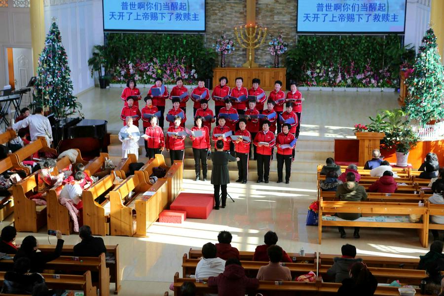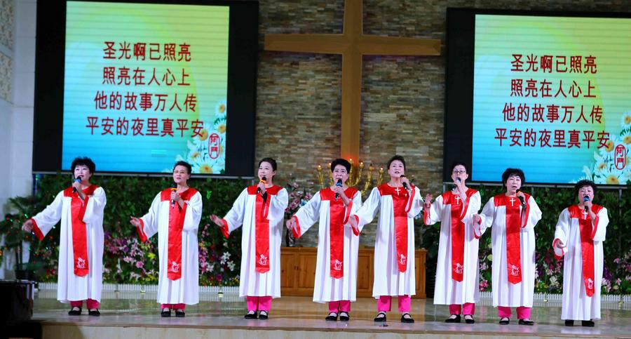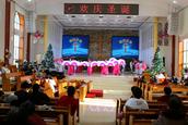 在圣诗班的赞美声中,刘雪光牧师问候大家圣诞节喜乐,然后带领会众诵读圣经路加福音的有关章节,以《把荣耀归给神》为题,分“牧羊人的美德”“救主谦卑的君王”两个题目为主证道。