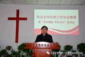 市基督教两会主任、会长张恩来牧师,首先向与会人员传达全市宗教工作会议的精神。张牧师指出,全体常委和教牧同工要紧跟时代步伐,积极推动基督教中国化落在工作的实处,在政治、神学、品格、法律和见识等方面加强自我学习和自我管理,成为自信、自律、自强、自爱的教职队伍。