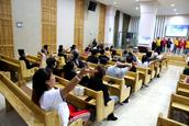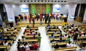 殿中前来聚会的会众,与台上的弟兄姊妹一起互动,同心合意的高歌赞美。他们当中有朝气蓬勃的年轻信徒,有银发矍铄的老年信徒、有跨越两个区辗转倒车过来的信徒。大家对赞美会充满了爱和喜欢,会众们时而起立举手、时而手拉手互相祝福高歌、时而大声宣告信仰,圣殿中凯歌高扬,余音绕梁、洋洋盈耳,铿锵有力,此时此刻慈悲荣耀的主就在我们中间。台上台下充满了圣灵的感动,充满了饥渴慕义的激情,信徒们的喜乐溢于言表,笑意写在脸上、崇拜刻在心版,热烈火爆的场面空前,这场面也感动了我,也情不自禁的参与到赞美之中,展开歌喉、举起双手赞美。
