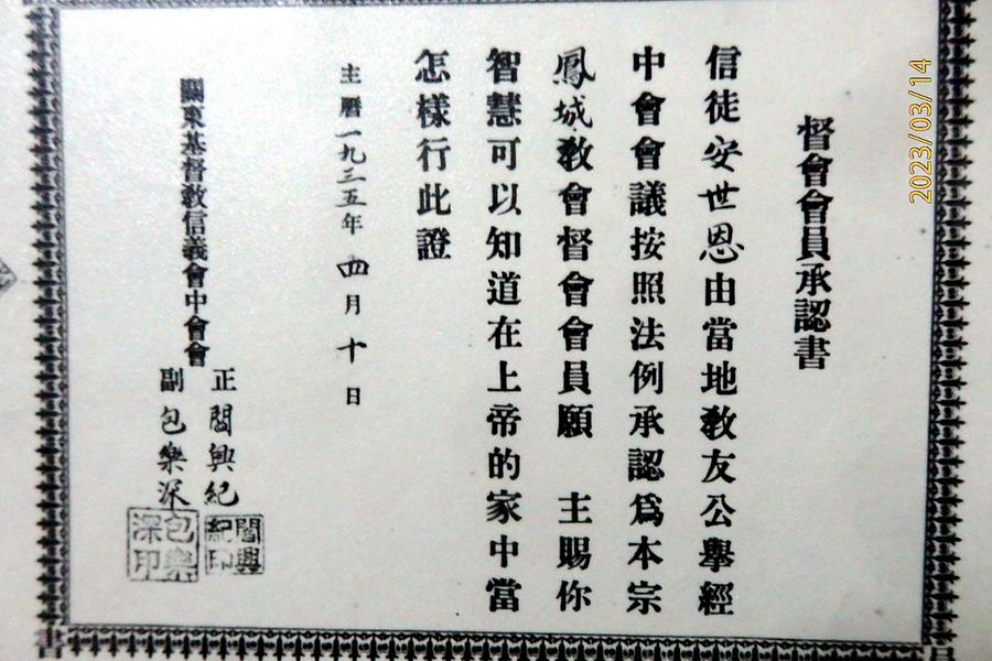 教会负责人金玉英牧师毕业于东北神学院二期,是一位爱主爱教、终身奉献的仆人,也是一位热心教会历史、搜集本堂历史的有心人。她保留了许多的珍贵历史资料,主内外一些对基督教历史研究的人士也经常到访,来查考这些资料。这些资料主要来自于丹麦信义会的档案复印件,有当年教堂建设的设计图纸、有讲堂建设时的场景照片、有信义会负责人的照片、有教会会员的承诺书、有丹麦教会与凤城教会的往来书信等等,特别是我看到那当年的黑白照片,教堂矗立在溪水边,而且还有钟楼,可见教堂的风采。可惜由于动荡的年代和现代的开发,溪水不见了,钟楼被拆了。教堂能够在这市内的黄金地段留存,已经是上帝的恩典了。