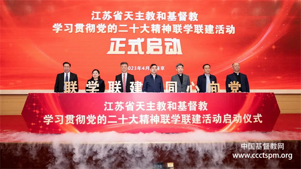 为深入学习贯彻习近平新时代中国特色社会主义思想和党的二十大精神,2023年4月12日,江苏省天主教和基督教两会在南京举行学习贯彻党的二十大精神联学联建活动启动仪式。中国天主教“一会一团”主教团主席、爱国会副主席沈斌主教,中国基督教协会会长吴巍牧师应邀出席并致辞;江苏省委统战部、省民宗委有关领导出席会议并发表讲话;全省各设区市民宗局相关人员,省佛教协会、省道教协会、省伊斯兰教协会负责人应邀出席;省天主教和基督教省、市、县级团体负责人和教职人员180余人参加了启动仪式和培训学习。