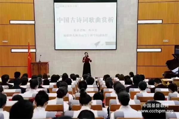 从梅老师的分享中,大家深切体会到诗中浓浓的情感和幽美的意境,受到经典文化的熏陶。最后,福建神学院学生合唱团献唱《领航》,由福建省合唱协会副会长、福建神学院圣乐系教授盛勇老师指挥。无论是老师们带来的民乐演奏、古诗词歌曲鉴赏,还是学生合唱团的混声合唱,都体现出他们对中华传统文化的自豪之情与传承之志。