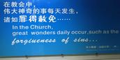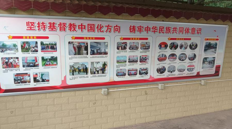 从教堂的小广场到院内的围墙、从一楼到二楼的主堂、从室外走廊到室内各个办公室房间、从教堂的大屏幕显示器到信徒手中的教会单张、从实地聚会到网络牧养……都有宣传,图文并茂。当人们走进教堂,就会看到相关的宣传板、宣传栏,你会感到这里基督教中国化、见证福音的力度很大、覆盖面积很大,哪怕是一统石头,也镌刻有“上帝是爱”。“爱”的福音宣传,使人们置身于信仰文化、党和政府政策的浓厚氛围之中。