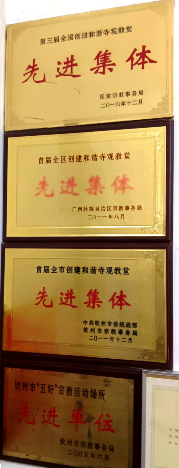 目前,钦州基督教会领导班子共有7人,其中3人专职(牧师、长老、传道各1名),全市信徒约有3500人。教会有健全的管理制度,制度上墙,公开、透明,接受政府主管部门及信众的监督。笔者看到了教堂的财务报表是对信众公开的。教会除正常的信仰传福音和举办各种圣事活动外,还组织信教群众学习宗教政策、宪法、法律法规,平时讲经传道也融入中华传统文化,铸牢信教群众的民族共同体意识,积极引导基督教与社会主义社会相适应,维护祖国统一维护国家利益和祖国尊严,树立基督教良好形象。教会、教堂被国家宗教事务局授予“第三届全国创建和谐寺观教堂先进集体”,广西壮族自治区宗教事务局授予“首届全区创建和谐寺观教堂先进集体”,中共钦州市委统战部、钦州市宗教事务局授予“首届全市创建和谐寺观教堂先进集体”等荣誉称号。