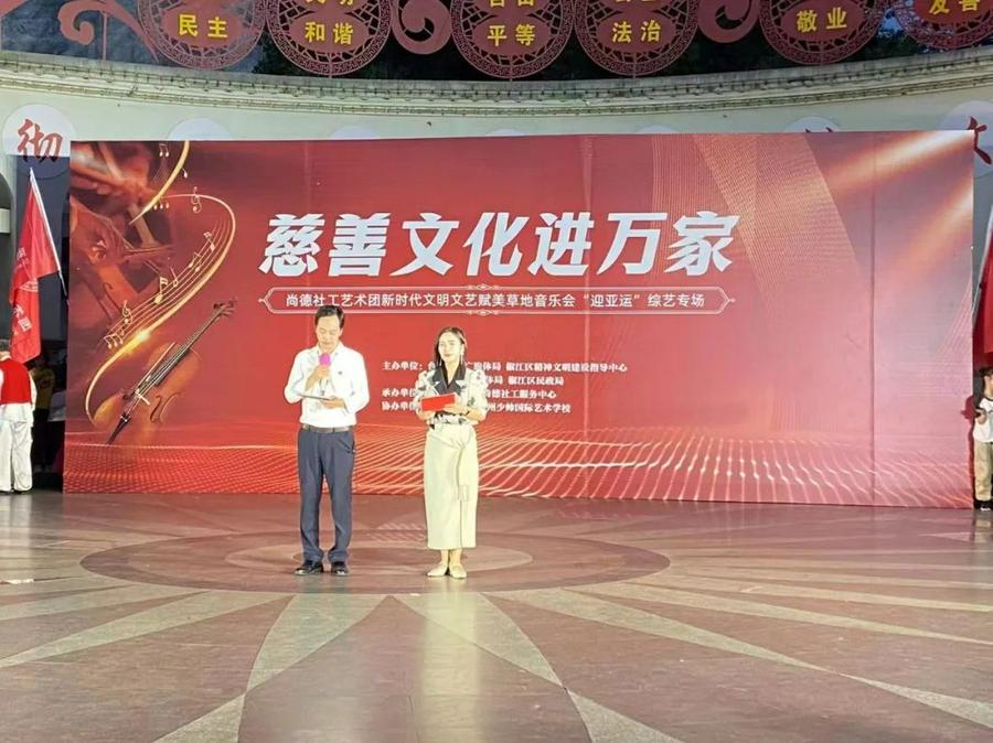 2023年5月27日晚,台州市文广旅体局、椒江区精神文明建设指导中心、椒江区文广旅体局、椒江区民政局、椒江区尚德社工服务中心等单位联合举办“慈善文化进万家”——尚德社工艺术团新时期文明文艺赋美草地音乐会“迎亚运”综艺专场晚会在椒江中山广场举行。