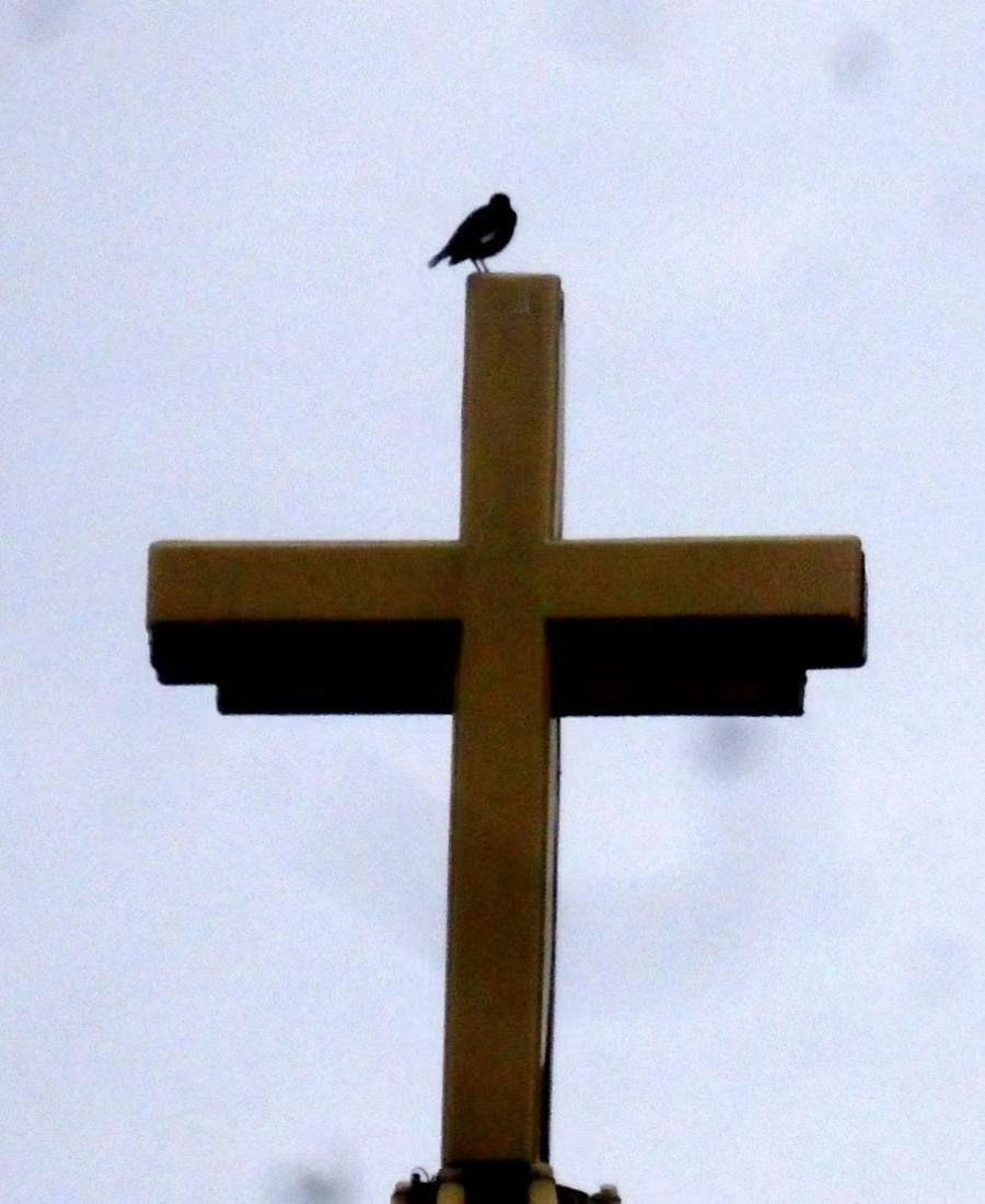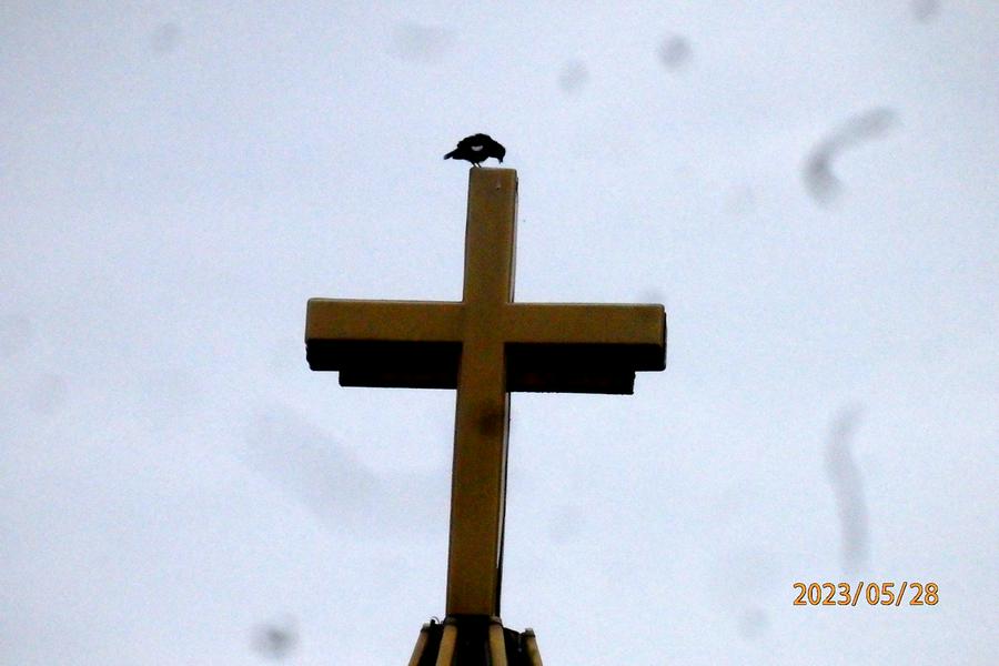 主日,笔者到大连百余年历史的北京街教堂聚会,远远望见教堂顶端的十字架上有一只喜鹊悠然自得的在上面,有感而发。“时人之家,闻鹊声,皆为喜兆,故谓灵鹊报喜。”(清代陈世熙:《开元天宝遗事》)