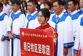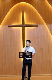第二个仪式是感恩礼拜,由蔡清香同工主礼,南日牧区圣歌团在陈丽星的指挥下献唱《圣殿的荣耀》和《你是我神》两首圣诗;岳清华牧师以使徒行传2章1至13节的经文作“圣灵降临”为题的证道: