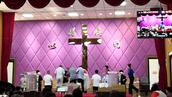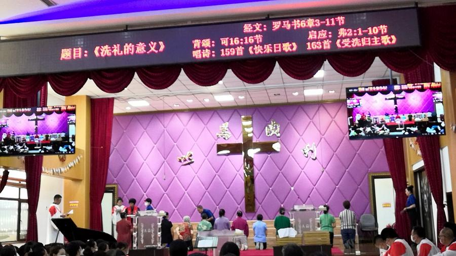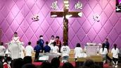 这59位肢体分批跪在圣台上方的圣十字架前,接受张牧师以祝圣的圣水洗礼,成为新人,实现了“你们受洗归入基督的,都是披戴基督了”。