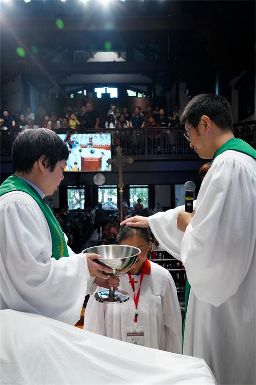 证道结束后,教会为9位弟兄姊妹举行点水礼,由黄明科牧师主礼,詹静波牧师襄礼。“你是否愿意接受耶稣基督作为你个人的救主?”“我愿意!”在众弟兄姊妹的见证下,黄牧师奉圣父、圣子和圣灵的名为他们施洗、为他们祝福。礼毕后,与众圣徒一同领受了新生命第一次圣餐。