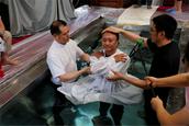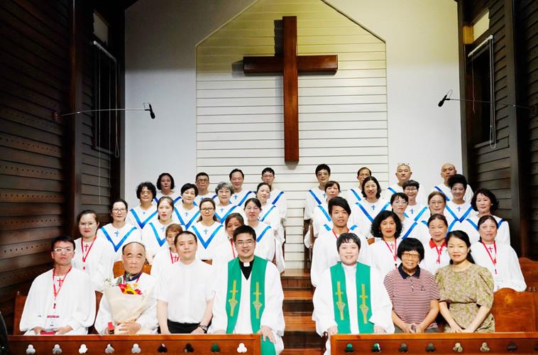 下午,教会为10位弟兄姊妹举行浸水礼,由黄明科牧师主礼,李恩临牧师襄礼。受洗者身着白色圣洁长袍,按照次序走向一楼讲台,走向十字架下方的浸礼池。
