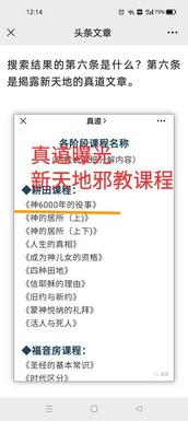 以前我没有如此近距离接触过异端邪教,这次的经历真的让我感到可怕。新天地的课程极具迷惑性,让人以为自己在学圣经,是纯正的信仰基督,实际上却是一步步落入魔鬼的网罗。魔鬼竟然都能利用人对真理的渴慕之心,伪装得如此像样。上面所说的圣经网站是搜索排名第一的,我无法想象有多少渴慕真理却还不明真理的人被它牢笼了去。昨天我提交了举报信息,希望能尽快处理掉它。