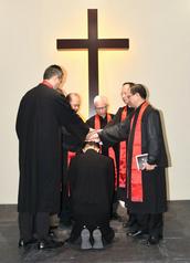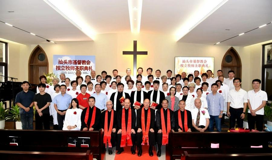 广东省基督教协会常务副会长雷玉明牧师、省基督教两会秘书长兼总干事林恩灵牧师、汕头市基督教三自爱国会主席詹海烈牧师、汕头市基督教协会会长方俊光牧师、汕头市基督教两会林献毅牧师和黄进恺牧师组成按立圣职牧师团。