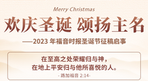 12月25日(周一)上午9:00将举行“哈利路亚”聚会点节目汇演,19:30将举行圣诞夜圣乐崇拜。