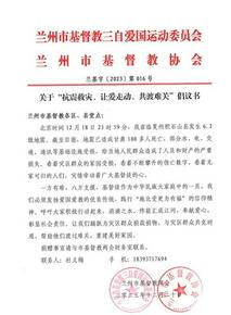 兰州市基督教两会20日面向全市教会发布《关于“抗震救灾、让爱走动、共渡难关”倡议书》,呼吁全市各区、县教会踊跃为灾区群众捐款捐物。