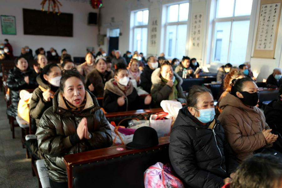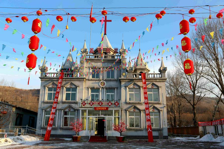 大雪寒流之后的小山村老虎屯教堂,小广场上国旗和彩旗迎风飘扬,一派祥和喜乐的场面。外面虽冷,但圣殿内恩主的温暖在圣徒心上。