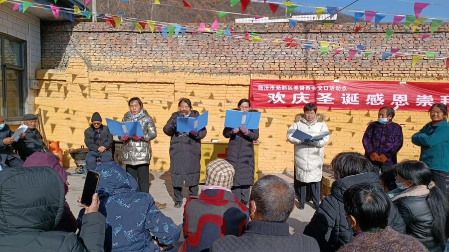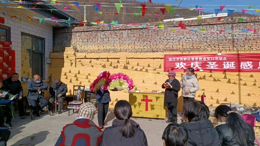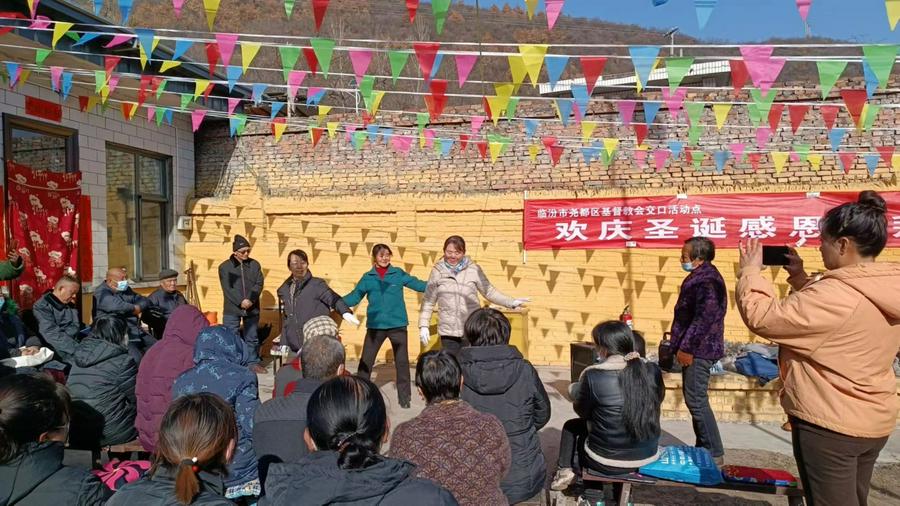 一年一度的圣诞佳节即将来临,天气相比往年奇寒,一场大雪过后,寒气袭人,地处吕梁山麓与乡宁县交界的的尧都区枕头乡交口村,山上仍白雪皑皑。在并不宽敞得教会院内,国旗迎风飘扬,人头攒动,相比城里里的大教堂,这里只是窄小的院内,不大的三间礼拜堂,被修饰得焕然一新,五颜六色的彩条飞舞,门口的大红对联更增添了几分节日气氛。一场别开生面的庆祝圣诞感恩活动正在热火朝天地举行,这是12月23日结对帮扶的临汾市尧都区福利巷活动点和第五牧区交口教会联合举办的圣诞感恩崇拜现场。