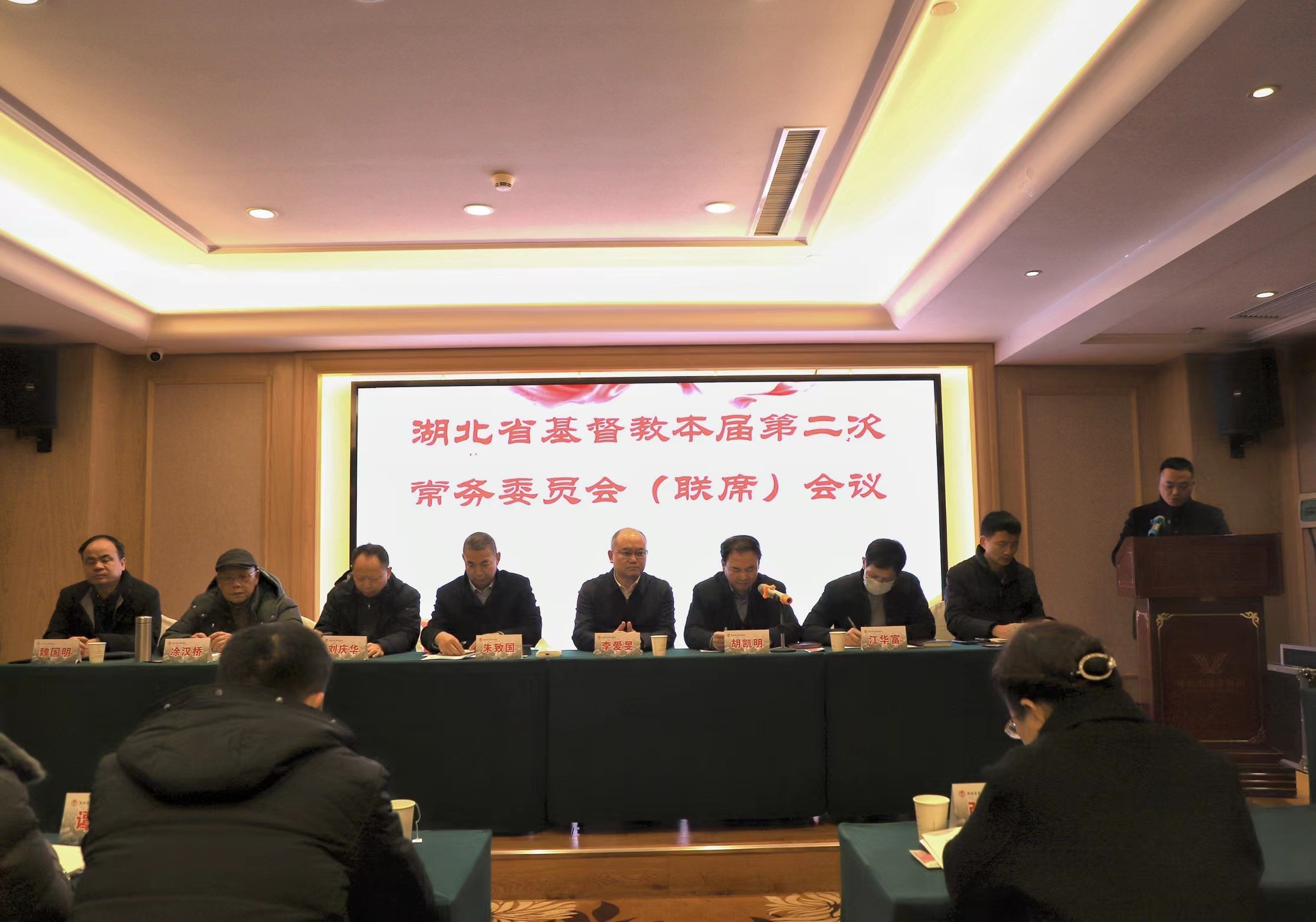 2024年1月25日,湖北省基督教两会在维也纳酒店二楼会议室举行了本届第二次常务委员会(联席)会议。省民宗委党组成员、副主任李爱旻、省民宗委宗教二处处长江华富、省民宗委二级调研员、中南神学院副院长刘庆华莅临指导工作。