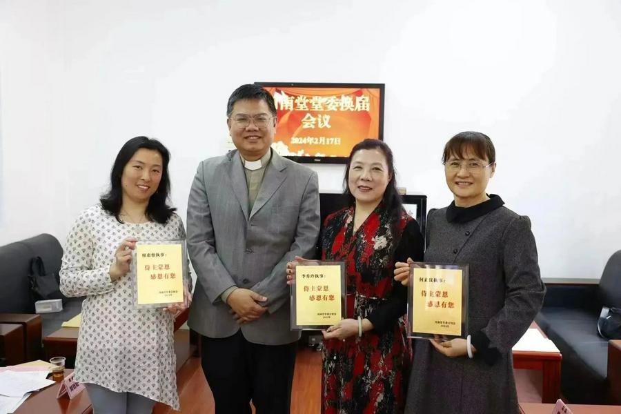 培灵会后,举行了2024年第一次堂委会,会上,完成 新旧堂委换届工作,冯伟文牧师代表河南堂向四位将要离任的堂委赠送了纪念奖牌,以表达对四位堂委多年来为河南堂各项事工竭力侍奉、摆上自己的感激之情。