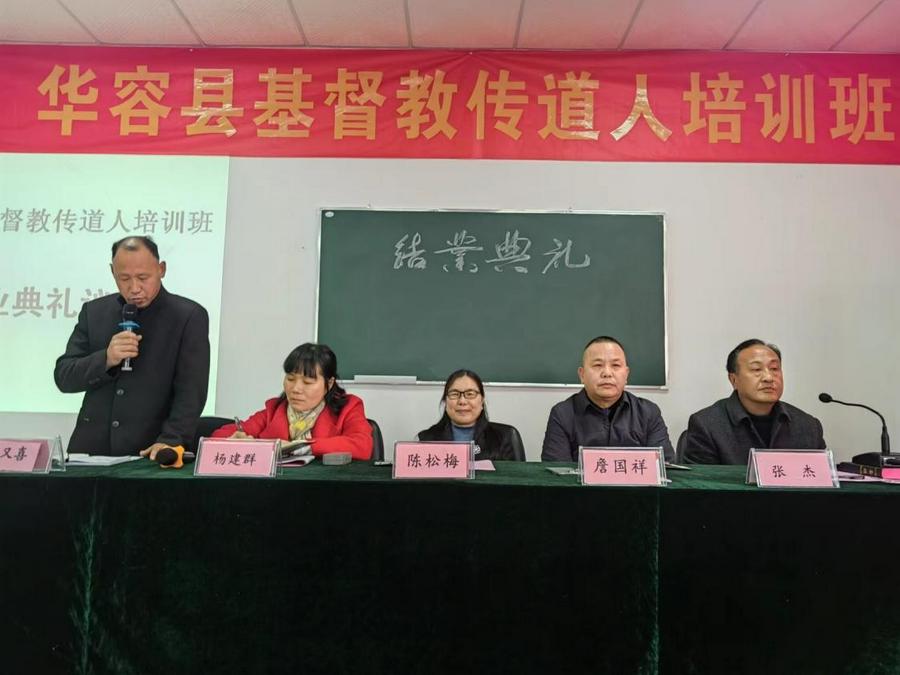 3月10日中午,培训班结业典礼在城关堂举行。张杰副主席主持结业典礼,杨建群副主席总结办班情况,白又喜副主席报告财务收支情况,詹国祥主席代表县爱国会向学员提出要求,市爱国会主席陈松梅牧师出席并讲话。陈牧师劝勉学员要忠于信仰,领受权柄,牢记使命,做神合用器皿,做群羊的好牧人;传讲正确的福音,传使信徒和睦、教会合一、社会和谐及世界和平的福音;不以势压人,以权制人,拉帮结派,分裂教会,而要以爱感人、以德服人、以榜样引导人,同心合意地兴旺福音;同时讲政治、讲诚信,要成为广大弟兄姊妹走爱国爱教道路的领路人。