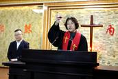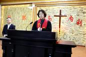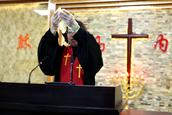 证道结束后,闫海山教士带领会众做省察的祷告,祷告中许多参会的信徒留下了眼泪。全场起立低沉吟唱《如果没有主的爱》,在闫教士的主持下,开始了圣餐仪式。全体会众在他的带领下省察自己的过犯。“亲爱的主啊,谁能安慰祢那忧伤的心;亲爱的主啊,谁能怜恤祢那滴血的心”,在全体人员唱诗《十字架的爱》中,李卓长老身着圣服来到圣台祷告、主礼今日晚间的圣餐。她奉主名诵读圣经有关经文,庄重地分别举起饼和杯来祝圣、祝祷,由服侍的同工将圣餐派发给受洗的弟兄姊妹;众人在李长老的带领下怀着感恩的心服圣餐。