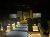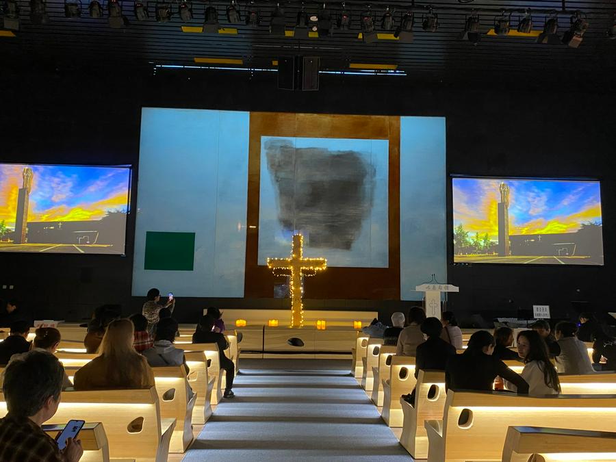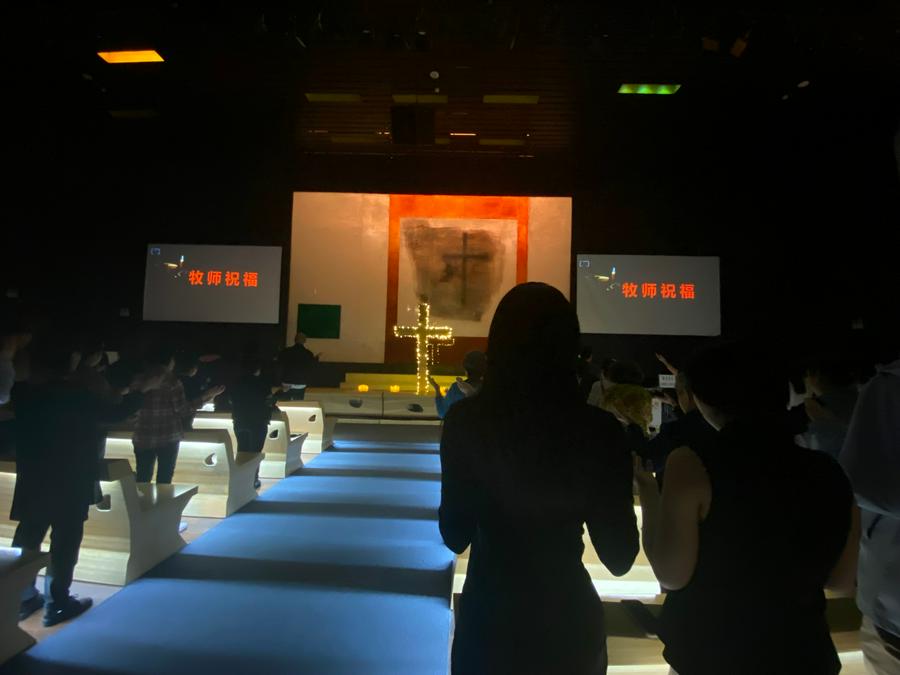 换了两次地铁,七点一刻到达光音堂,一进礼拜堂大门,讲台上布置温馨的十字架就映入眼帘,堂内的微光也让人不由自主安静下来。
