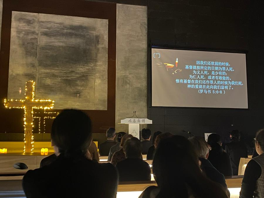 “他诚然担当我们的忧患,背负我们的痛苦。我们却以为他受责罚,被神击打苦待了……耶和华使我们众人的罪孽都归在他身上”,会众一起朗读经文,始终在幕后的主持人和牧师带领大家默想十字架和我们的关系,并做回应祷告。