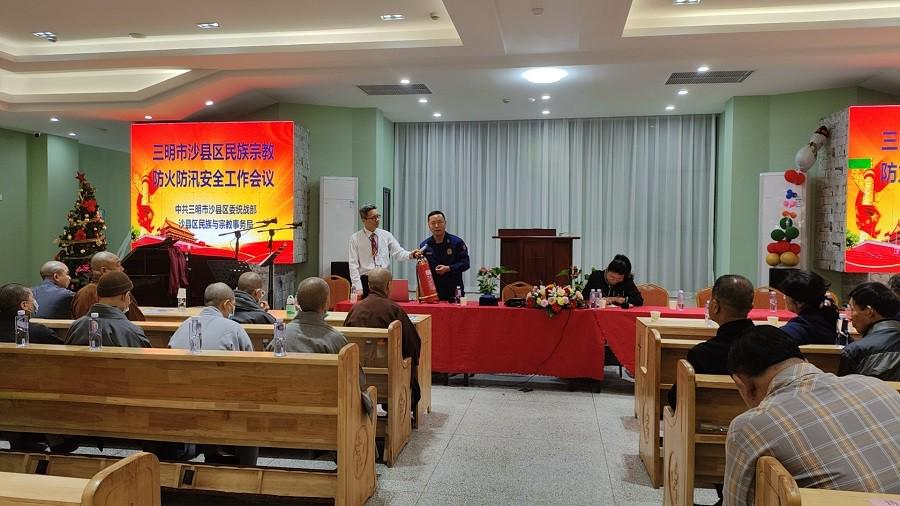 2024年3月29日上午,福建沙县区委统战部、区民族宗教局联合区消防救援大队、公安分局国保大队在沙县区城南基督教堂聚会点召开沙县区民族宗教防火防汛工作会议暨消防安全标准化现场会。区直相关单位领导、宗教团体负责人、秘书长、宗教活动场所(含民间信仰)负责人、及民族村主干等共计60余人参加会议,其中基督教三自爱国会委员、各堂堂管会骨干20余人参加。