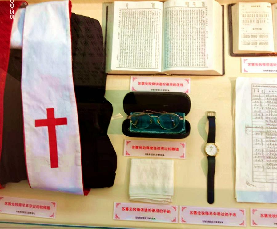 我在长春西五马路教堂的“全国宗教界爱国主义教育基地”的展馆里,瞻仰了苏赛光牧师的照片和遗物,有圣经、赞美诗本、十字架披肩、手表、眼镜等,眼前不禁浮现出老牧师当年爱国爱教、荣神益人的风采。苏牧师在服侍的吉林省、长春市和西五马路基督教会半个多世纪以来的经历和奉献,老牧师是不折不扣的见证者,也留下了宝贵的属灵财富、不可磨灭的记录,激励后来人继往开来、砥砺前行。